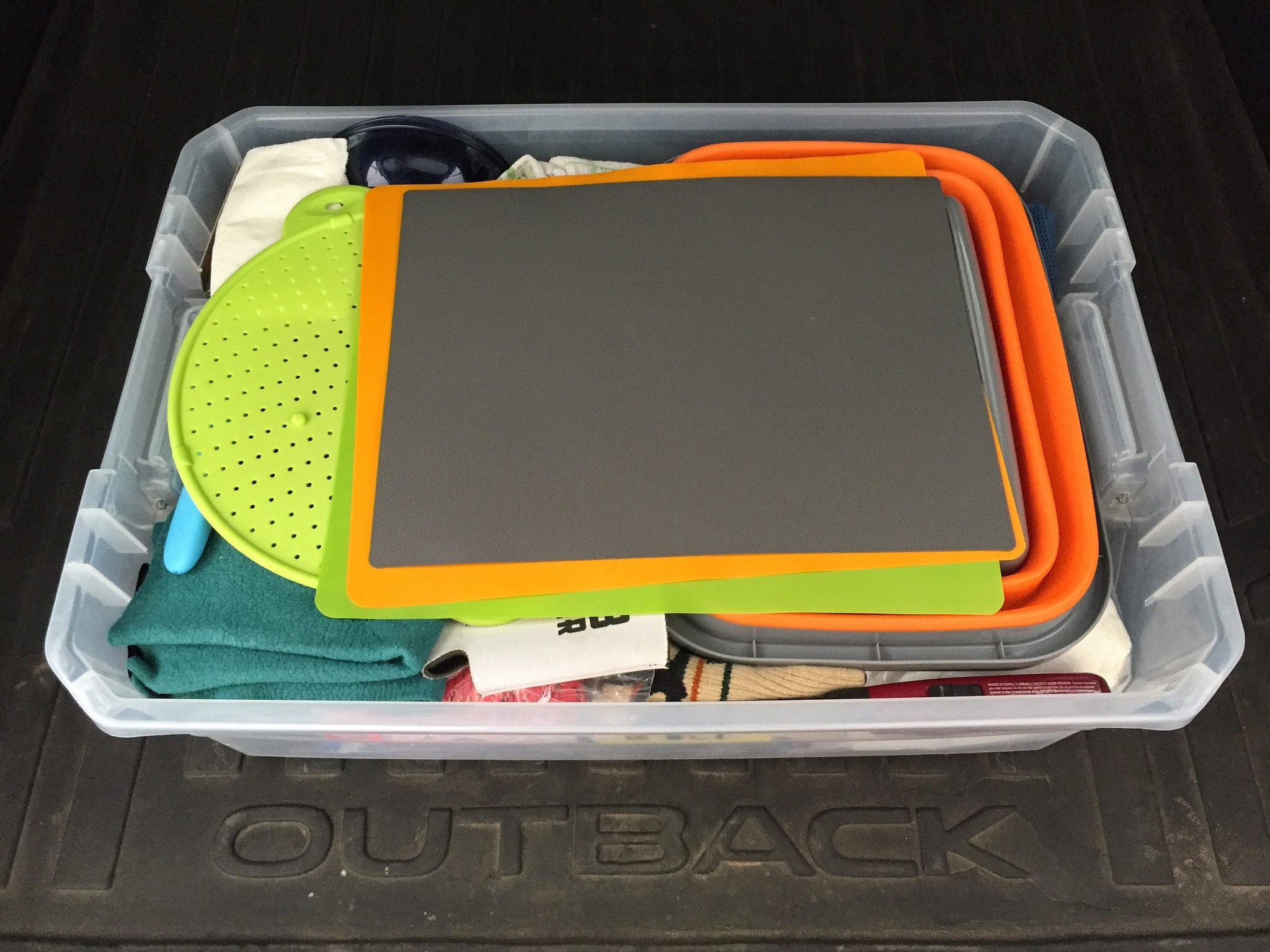 When I'm traveling on a road trip like this, I prefer to keep my setup as simple and organized as possible throughout the trip. That means thinking about where everything goes before I hit the road, making sure that the things I'll need to access—either while I'm traveling or when I'm in bed—are easily accessible. That's why I try to keep everything in a container. So food and snacks go into one bin, and the cooking stuff goes into another. That makes it much easier to stay organized. The main exception to this is my clothes. I prefer to have clothes stored in batches so that it's easier to pick out what I need without having to struggle to extract an entire duffel bag.